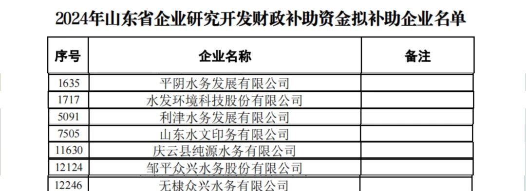 近日,山東省科技廳正式公布了2024年山東省企業(yè)研究開發(fā)財政補助資金擬補助企業(yè)名單,水發(fā)水控集團旗下共有7家企業(yè)成功獲批,取得政府補助33萬元。