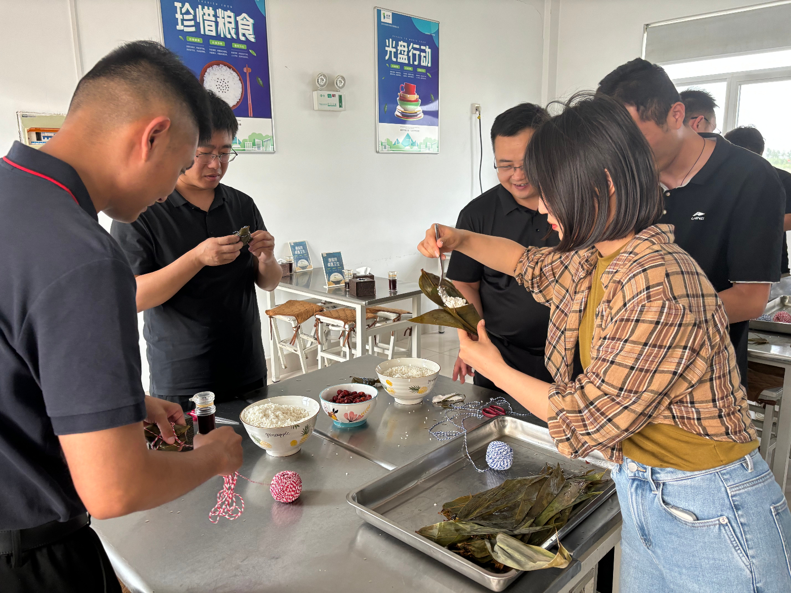 在一片祥和的節(jié)日氛圍中,大家圍攏在桌旁,邊學邊練,互相協(xié)作,折粽葉、填糯米、裹葉子扎線.......一道道工序有條不紊,忙得不亦樂乎。一張張翠綠的粽葉在手中翩翩起舞,一個個有模有樣的粽子迅速成型,大家手把手傳承著端午節(jié)的傳統(tǒng)文化,共同感受著中華傳統(tǒng)文化的魅力。