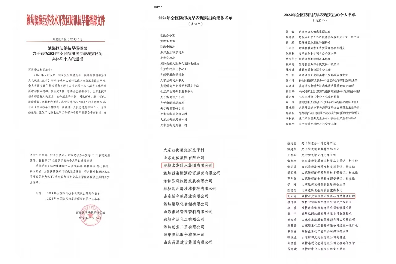 近日,濰坊市濱海區(qū)防汛抗旱指揮部下發(fā)《關(guān)于表揚(yáng)2024年全區(qū)防汛抗旱表現(xiàn)突出的集體和個人的通報》,濰坊水發(fā)供水集團(tuán)及公司員工劉天奇,分別榮獲防汛抗旱表現(xiàn)突出的集體和個人表彰。