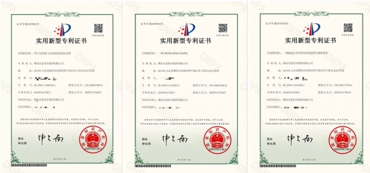 此外,濰坊區(qū)域還新增3項(xiàng)實(shí)用新型專利,涵蓋設(shè)備安裝、系統(tǒng)防護(hù)與維修維護(hù)等多個(gè)應(yīng)用場(chǎng)景:《用于安裝閥門啟閉設(shè)備的固定裝置》提升了復(fù)雜環(huán)境下的施工效率;《一種可削弱水錘效應(yīng)的閥體》增強(qiáng)了供水系統(tǒng)穩(wěn)定性;《一種能適應(yīng)不同管徑的管道帶水維修裝置》實(shí)現(xiàn)了高效不停水維修。三者與前述發(fā)明專利、軟著協(xié)同發(fā)力,初步構(gòu)建起“檢測(cè)-控制-維護(hù)”的水務(wù)管網(wǎng)技術(shù)創(chuàng)新體系。